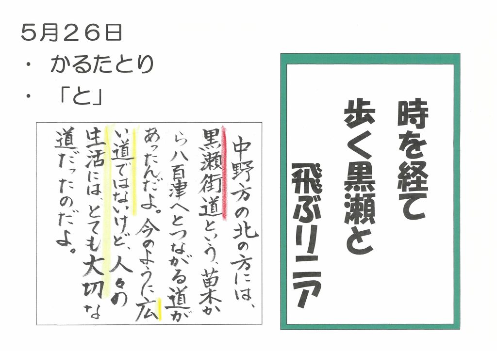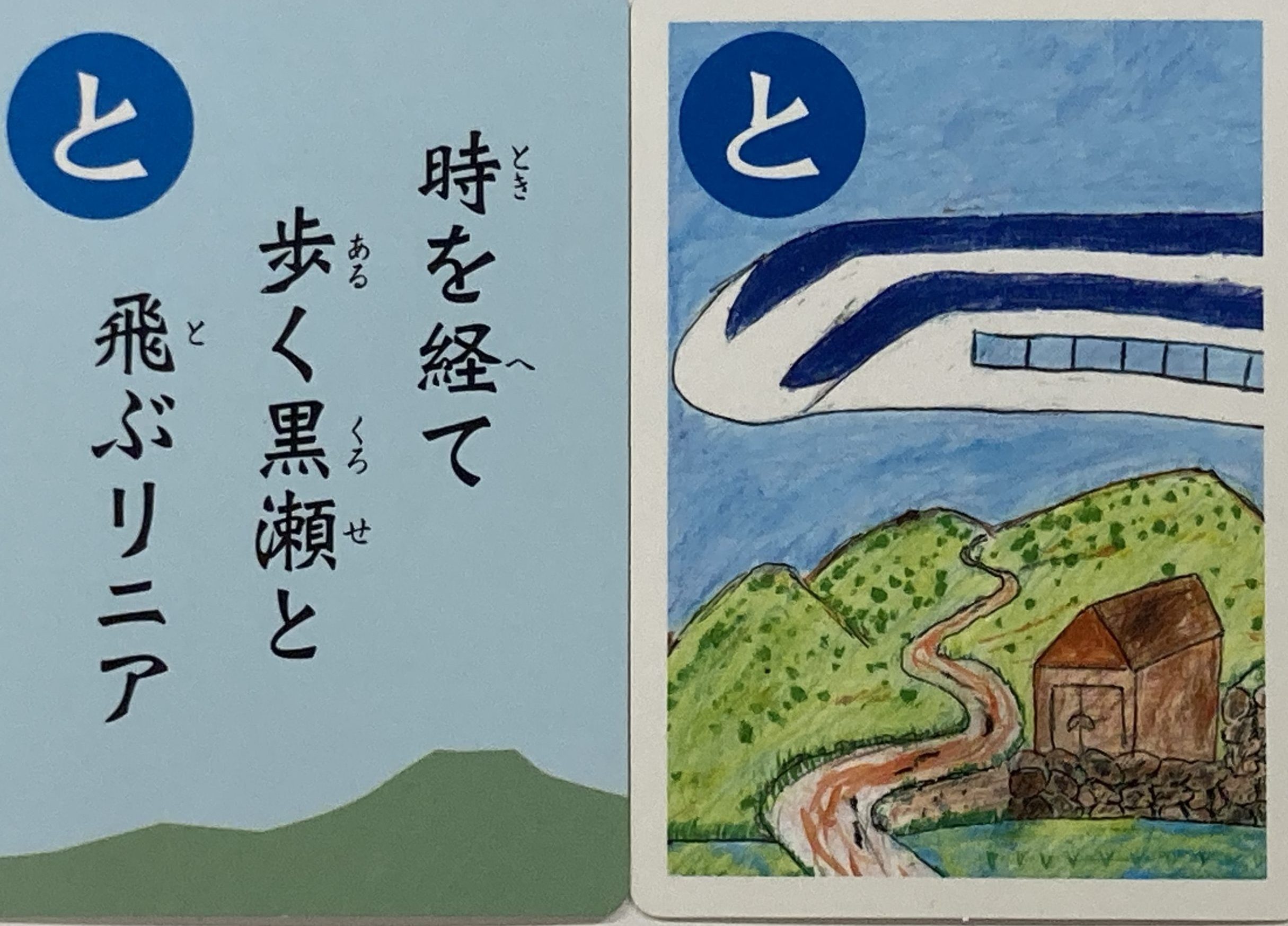 今日のかるたは「時を経て 歩く黒瀬と 飛ぶリニア」です。